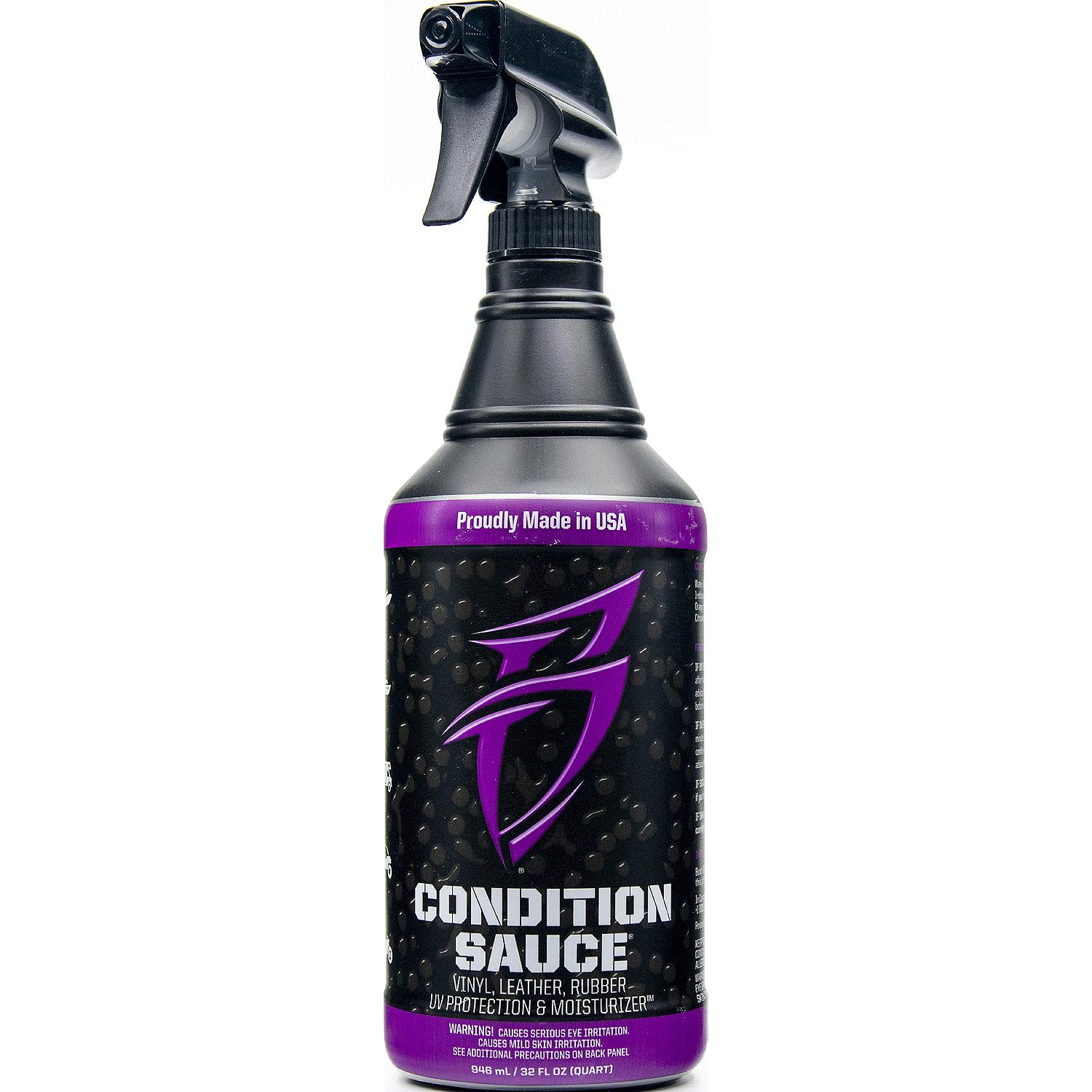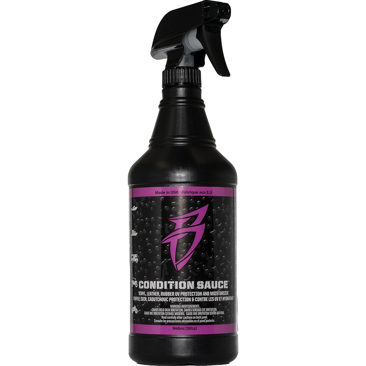 Protect your investment. Unlike generic surface dressings that leave greasy, slippery residue, Condition Sauce is a functional UV protectant designed to block the sun’s harmful rays, prevent fading, cracking and discoloration from vinyl, leather, rubber and plastic while moisturizing the material to provide the stunning “like new” look.