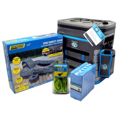 Ultrasoft Airmesh for comfort & cooling. Weightless, stress-free comfort lounging with arm rests and leg bolster. Multi-position seating is fully adjustable to sit low or high in the water. Soft fabric covered high buoyancy air pillows. Comfortably suspends you in the water. no wires. Pack ‘n go design. Compact and quick to inflate. allows water to drain easily. perfect for the pool or vacation. Bundle Includes: (Qty 2) 50-86833 Seachoice Zero Gravity Chair; 50-40531 Seachoice Floating Rope w/Hooks-Twin Pack; 505-50051 Yachters Choice Soft Cooler-35 Can Capacity; 505-50061 Yachters Choice Ice Pack-Six Pack