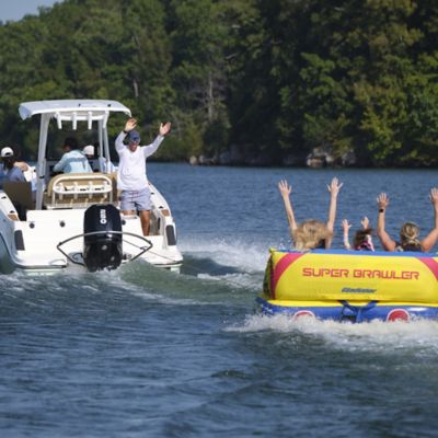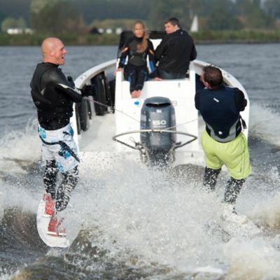 Upgrade your boat for tubing, wakeboarding, and waterskiing with the TurboSwing tow bar. This heavy-duty, stainless steel tow system mounts to your outboard motor bracket and elevates the tow rope above the wake and features a patented pulley system that moves freely along the curved bar, reducing jerks and maintaining steady tension during turns and takeoffs. Easy to install yourself using the existing hardware on your motor-no special tools required.